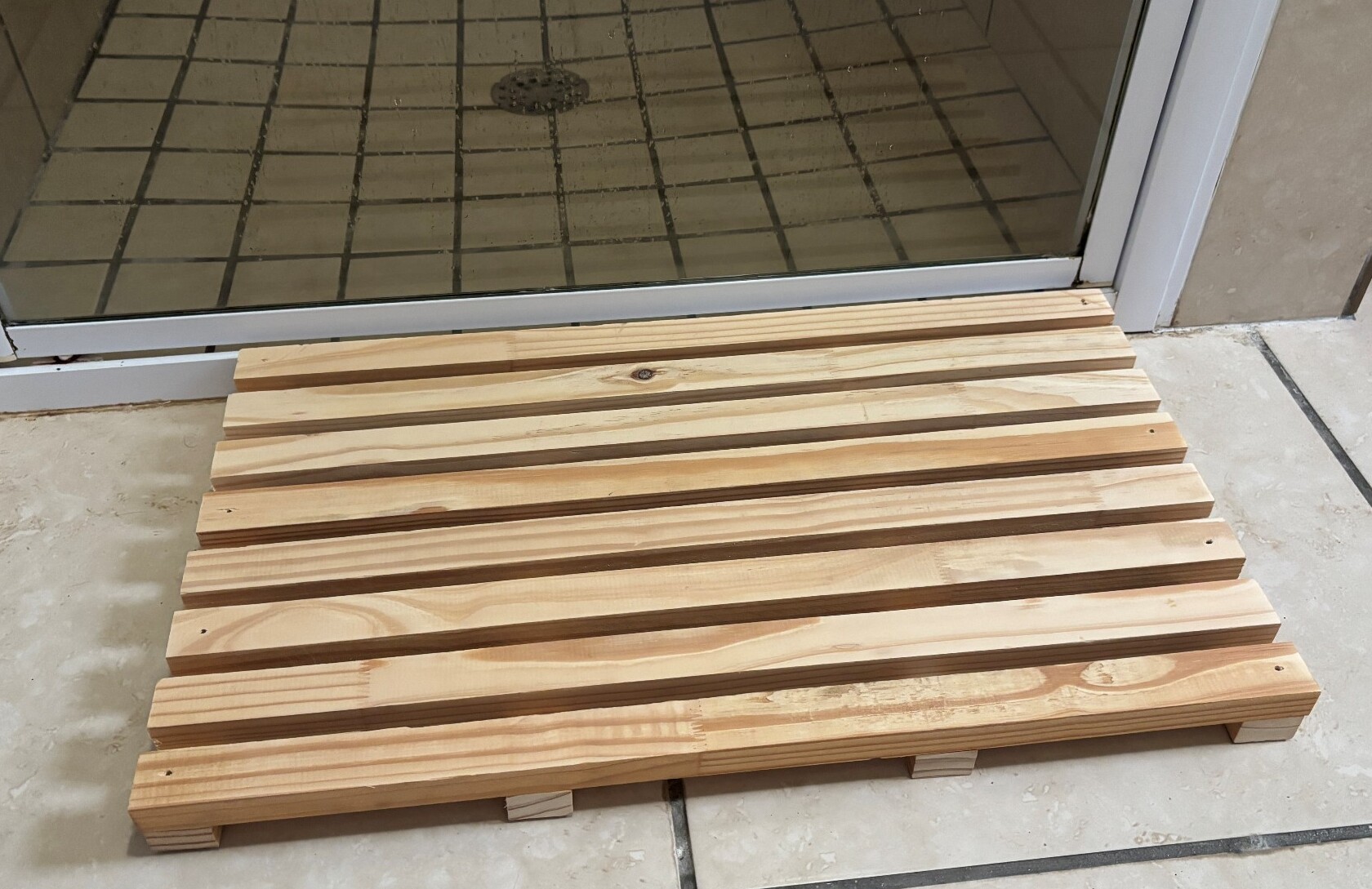 An elevated bath mat can be a great asset to any bathroom, particularly for those who do not have great ventilation. Most store-bought bath mats sit flush on the ground and therefore can get soggy or damp, especially in the wintertime. The DIY bath mat helps to provide airflow underneath a towel or material mat that could be placed on top of the DIY Bath Mat when getting in or out of the shower, or just use it in its raw, wooden state. The DIY Bath Mat can be built from one size of wood, so it is a great Project if you have scraps lying around or just want to do a simple project that will not break the bank